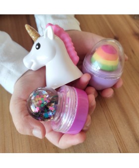 Imagina abrir una cajita en forma de cabeza de unicornio y encontrar dentro un lip gloss de un rosa encantador con el irresistible aroma de las fresas. Nuestro lip gloss de un rosa espectacular no solo proporciona un suave brillo a los labios sino que también los hidrata y cuida, gracias a su fórmula suave y nutritiva.