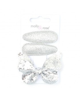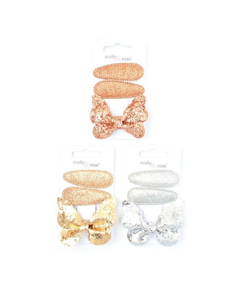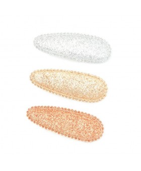 Pack de accesorios para el pelo compuesto por 1 pinza tipo cocodrilo con lazo y 2 clips forrados con brillantina, diseñados para aportar un toque brillante y elegante a cualquier peinado.