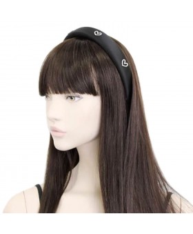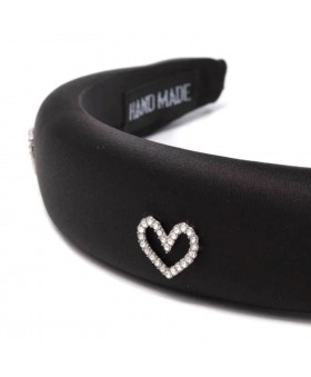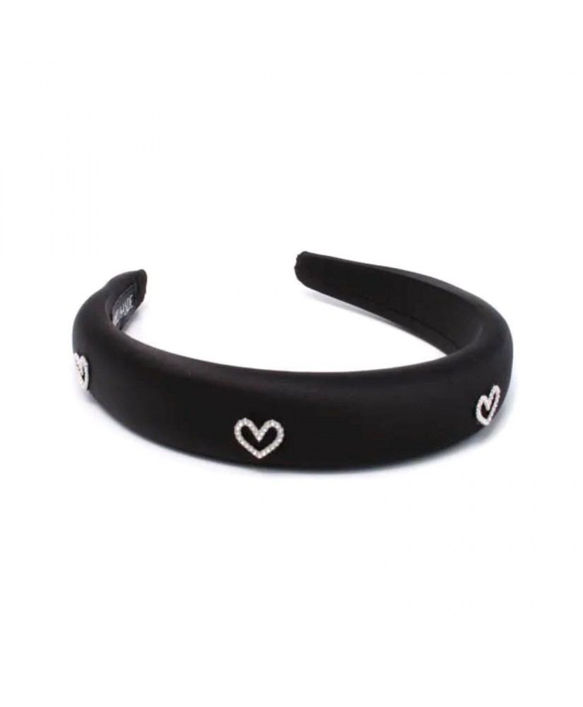 Diadema de plástico forrada de tela y acolchada en color negro con adornos de corazones de cristal