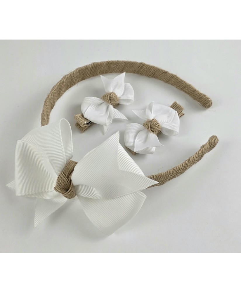 Set de 3 piezas para el pelo con diseño original de diadema y pinzas elaboradas con Yute y cinta otomán: